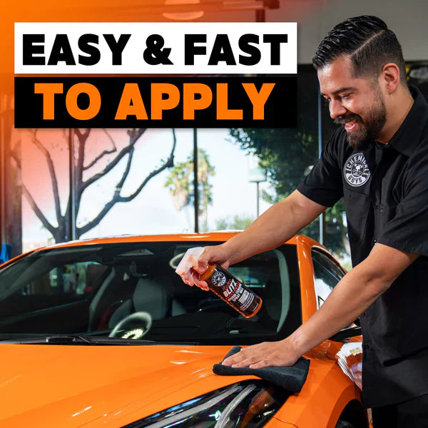 HydroBlitz is a hybrid ceramic spray wax that offers the quick application and shine of traditional wax, combined with the enhanced protection and impressive water beading of ceramic coatings. It's designed for those who want a fast and effective way to get a glossy finish while ensuring long-lasting durability for their vehicle's surfaces.