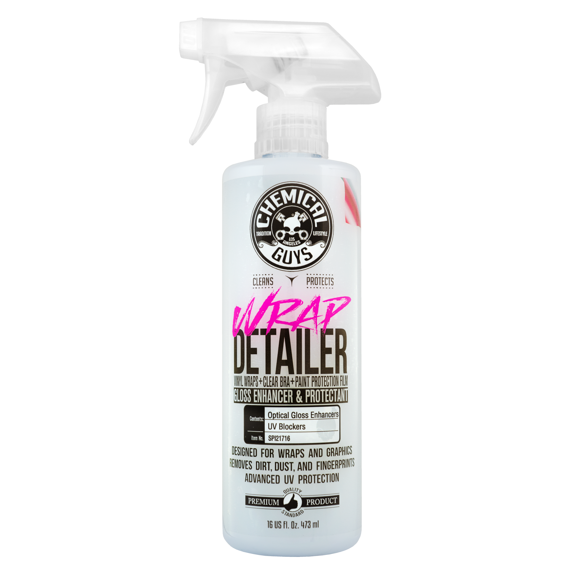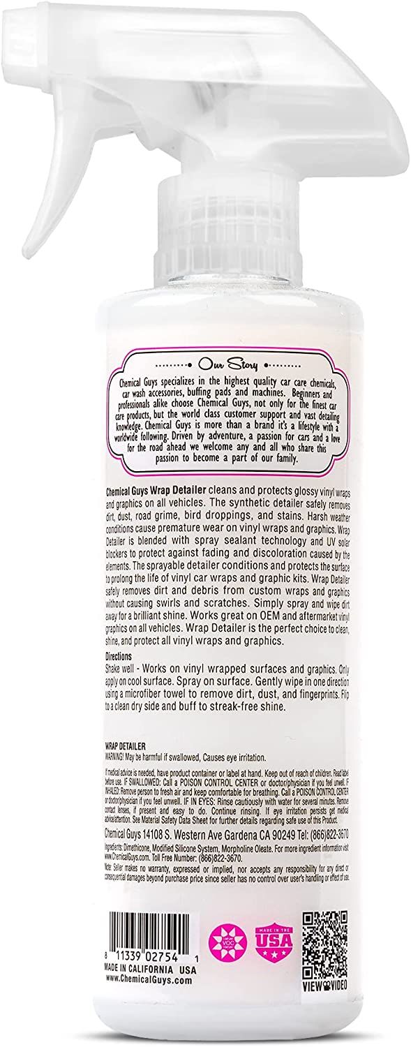 Wrap Detailer is formulated with spray sealant technology to protect vinyl-wrapped surfaces and graphics from premature aging. Advanced sealant protects against stains, moisture, and road grime that destroys vinyl wraps over time. Sealant technology blocks harmful UV solar rays from permanently fading and discoloring vinyl wraps and decals, ensuring that your car stays looking just wrapped!
