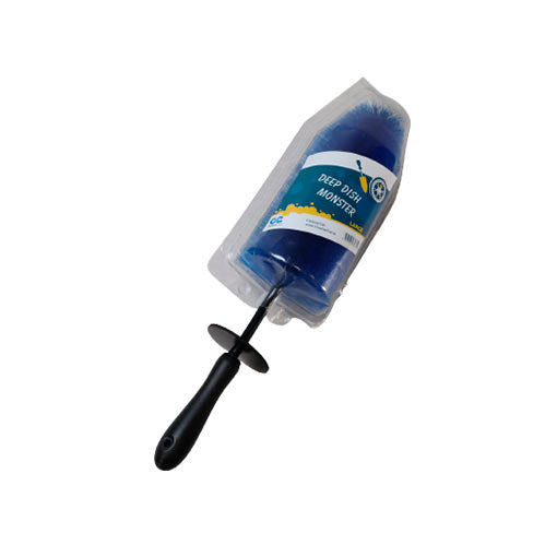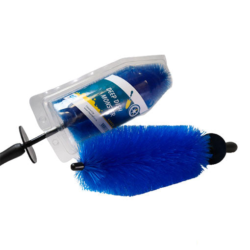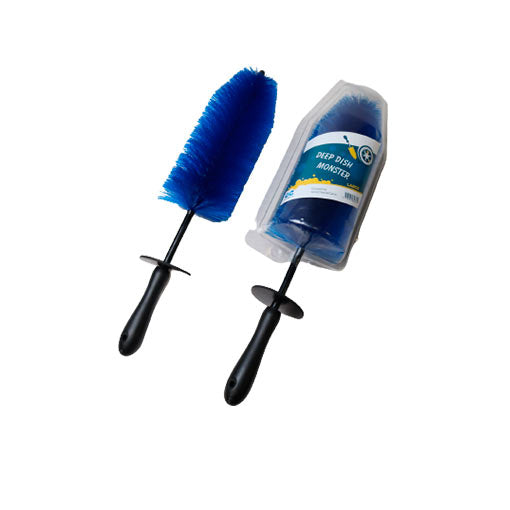 The Deep Dish Monster Brush is made of soft, Nylon Nylex bristles that gently loosen dirt from metal surfaces without scratching or dulling the metal. The bristles have a memory design which allows them to always return to their original shape. They are resistant to chemicals so you can use any kind of cleaner with the Deep Dish Monster Brush. Vinyl is bonded to the tip of the brush and a non-scratch sleeve covers the space between the handle and the bristles so that no part of the brush can scratch. The contoured handle is easy to hold and features a rubber knuckle guard. A vinyl coated flexible stem allows the brush to conform to every curve on your bike or vehicle. The Deep Dish Monster Brush measures 4” wide and 18” long. However, the bristles flatten to allow the brush to fit virtually anywhere. Use the Deep Dish Monster Brush to clean between spokes, grills, pipes, around bumpers, exhausts, engines, between the forks, by the chain, and anywhere else that conventional cleaning tools will not fit.