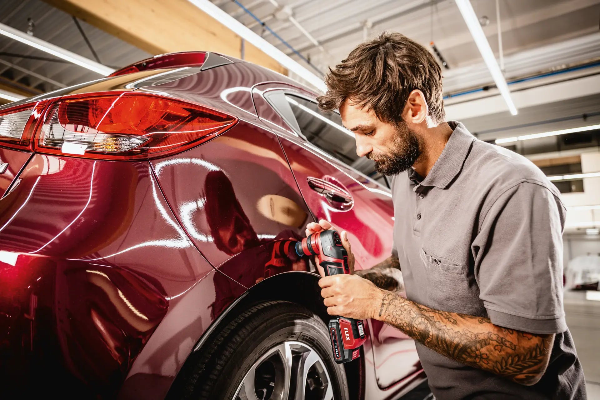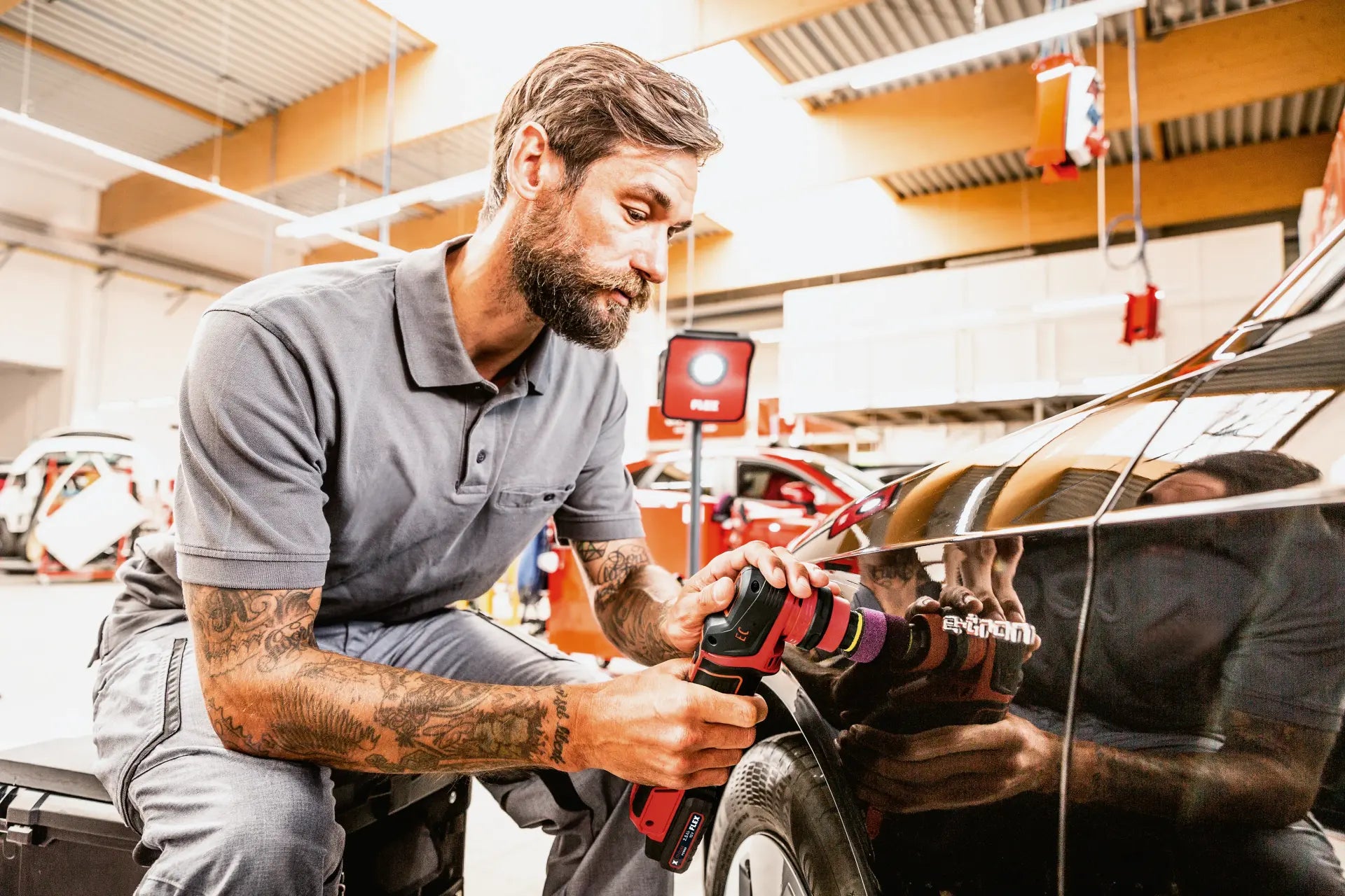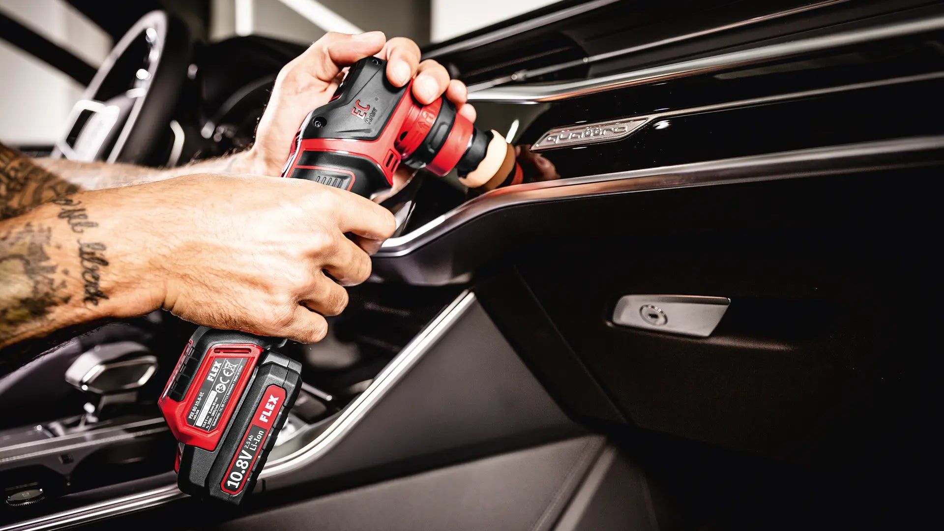 Incredible flexibility in car refinishing thanks to the cordless smart polisher. With the PXE you're ready for any task - from spot disc grinding to hologram-free finishing - with just one polishing machine. The polisher impresses with its simple and toolless quick-change system, allowing you to switch between a rotary or random-orbit drive in just 10 seconds. As well as ensuring optimum weight distribution, clever positioning of the 12 V battery also allows sensitive guidance of the polisher to suit the user. Gives the user maximum freedom of movement and comfort when polishing and refinishing rims, cars, motorbikes, boats, motor homes, trucks or aircraft.