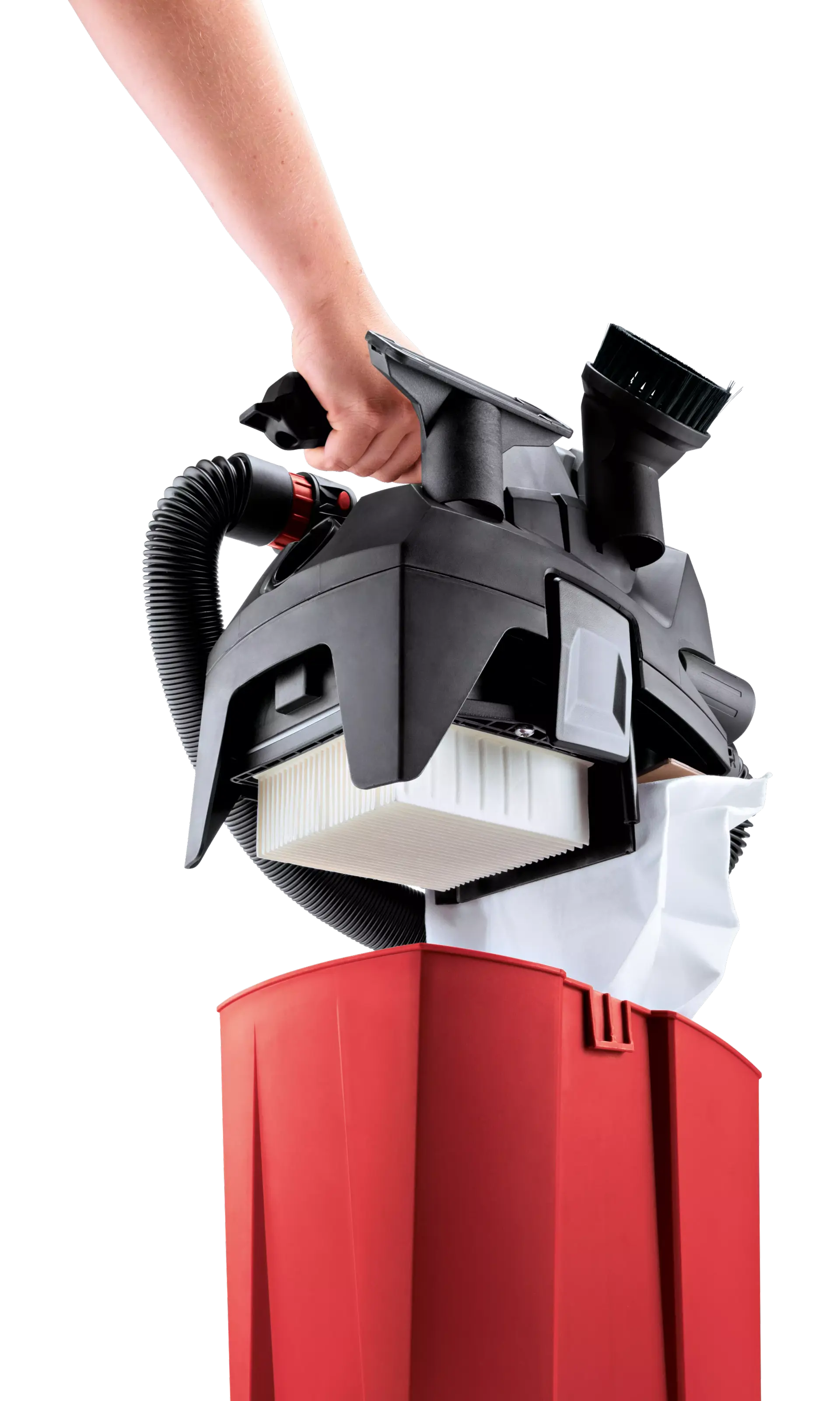 Flat-fold filter for optimised cleaning and improved container filling. Accessories can be stowed due to integrated brackets on the suction head. With 32 mm diameter compact hose with a length of 0.5 m can be extended to 2.5 m. Very handy, for easy transport of the vacuum cleaner.