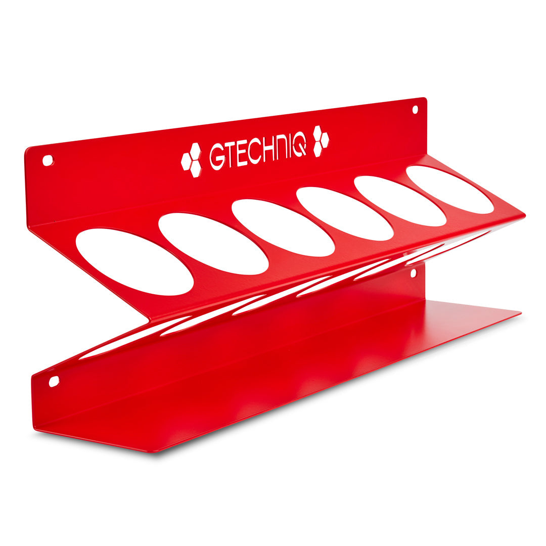 The wall-mounted coating caddy has been designed to hold 6, 500ml Gtechniq bottles. The unit is constructed of high-grade steel and has a matt red powder-coated finish. Each holder comes with a laser-cut Gtechniq logo and hexagon design. The coating holder measures 495mm wide x 95mm deep x 180mm high. Wall mounting screws are not included.