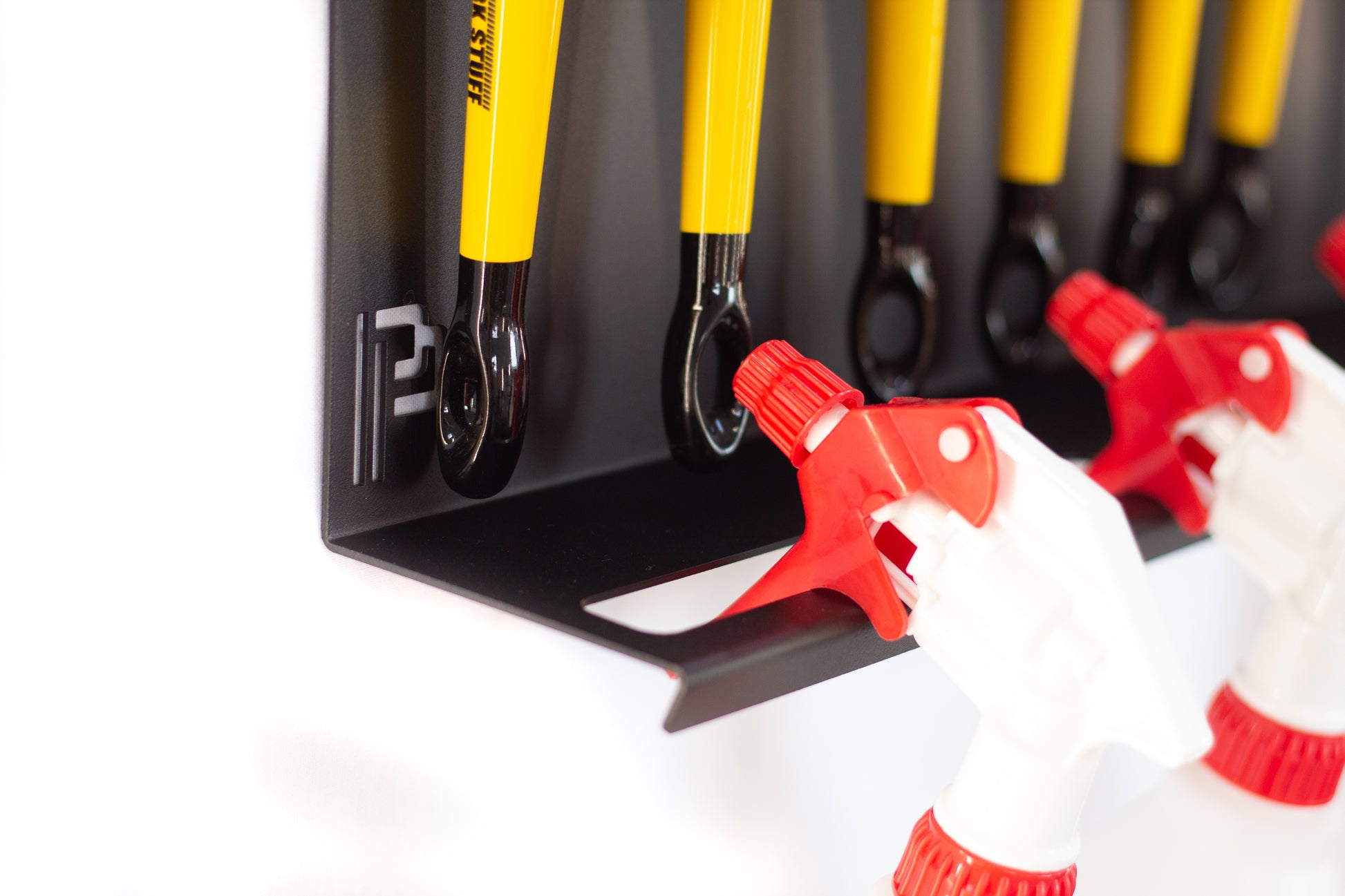 Functional and comfortable brush holder. The upper openings are suitable for most brush sizes. The lower channels are suitable for most types of atomizers and sprayers. The solid structure will hold up over 10 kg of load without lifting. Made of high quality, durable steel. Precisely cut and bent, finally covered with a powder finish to provide an additional protective layer against oxidation