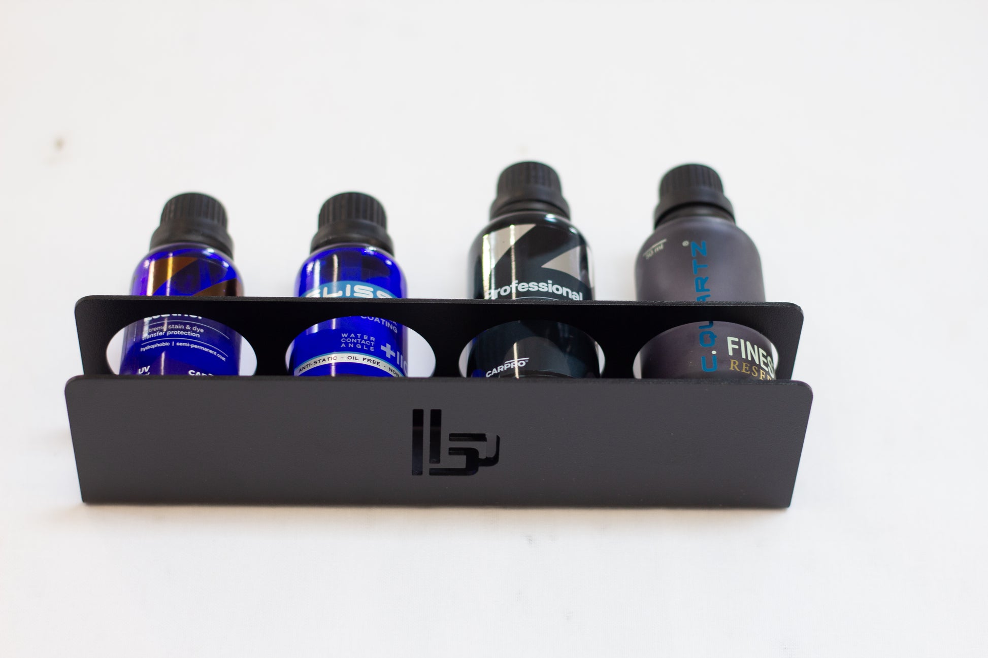 Specially designed stand for coatings, prevents them from falling over and increases work comfort. Four holes, two 42mm in diameter and two 41mm in diameter will accommodate the majority of 30ml and 50ml bottles with coatings available on the market. The free-standing stand can be placed anywhere near your workstation or directly on your detailing trolley. Durable steel and powder finish guarantee perfect appearance and durability of the material.