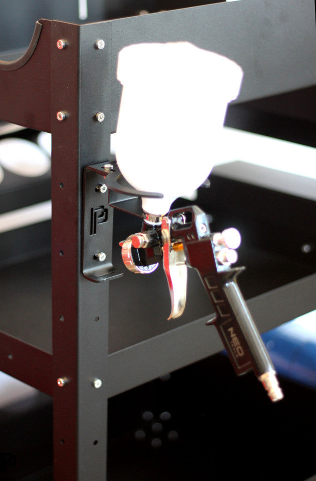 High-quality holder for the safe storage of spray guns with adjustable support for various sizes of fluid containers. Possibility to hang one gun at a time.
