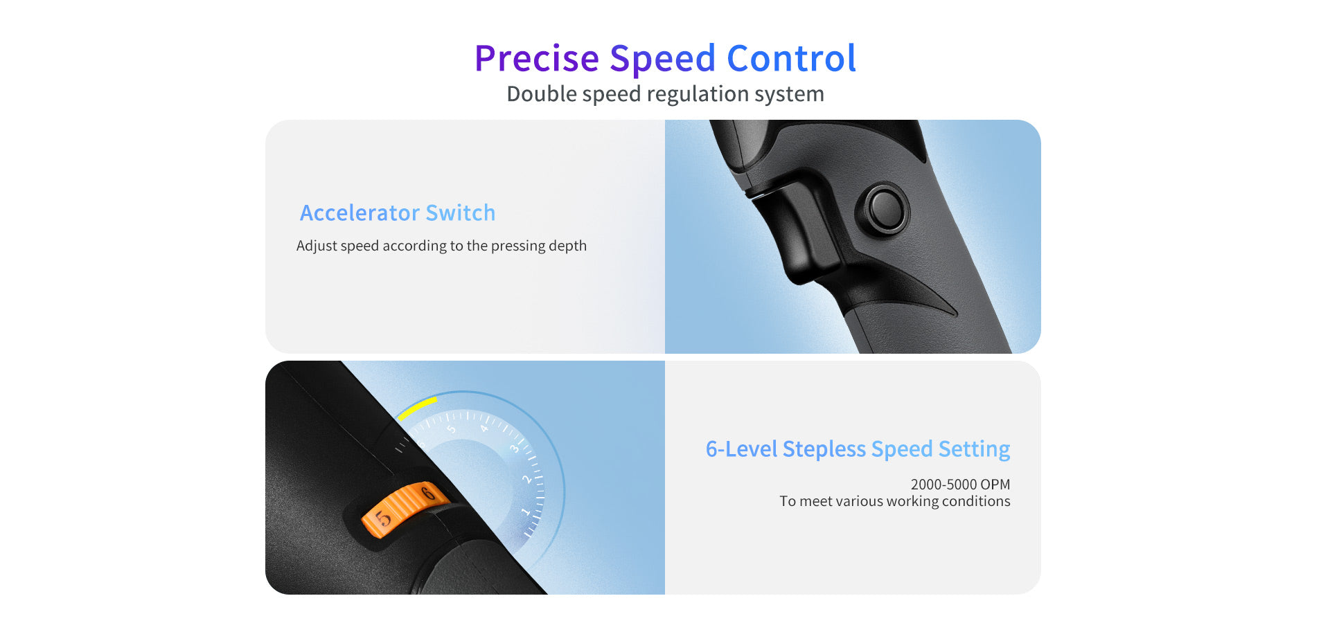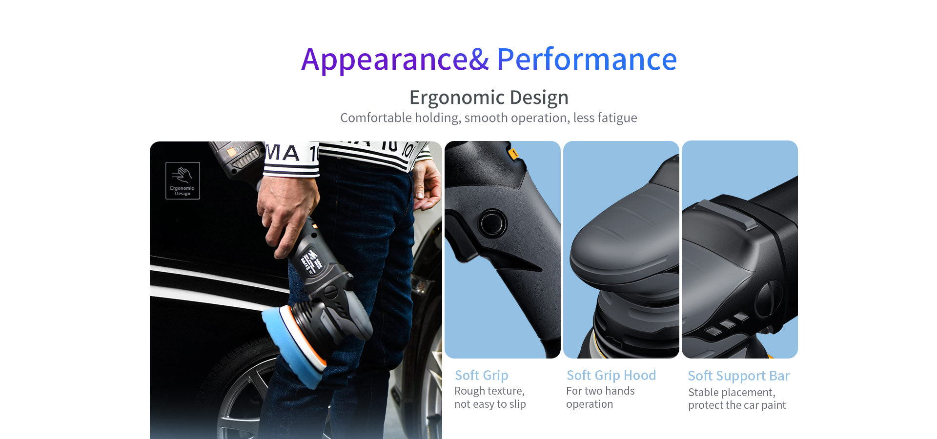 The ShineMate EB351 oozes quality and features high-precision CNC components and vibration inhibition technology for smoother operation and the “DustDevil” multi-hole backing plate helps to reduce heat and dust. The ergonomic design features a soft grip handle and hood for easy and secure operation. A soft support bar at the head of the machine also allows for it to be set down securely when not in use.