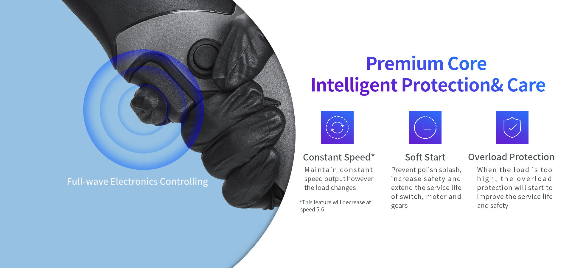 The brushless motor in the EB351 delivers high torque with greater efficiency and smoother operation. Dual speed regulation gives you complete control over the machine when you need it. It allows you to select a speed on the wheel but also have finer control with a progressive trigger. The EB351 features digital control technology which gives you smooth start-up to prevent polish being slung across the vehicle and overload protection to extend the service life of the machine.