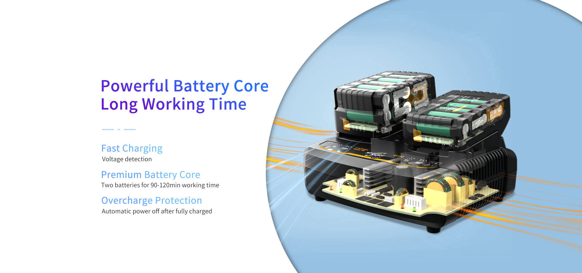 Polish anywhere, any time with the Shinemate EB351. The 5.0Ah batteries that are supplied with the machine give 45-60 mins of run time and fully charge in 60 minutes. The batteries feature high quality Samsung cores which give a long service life with 500 times charging and discharging and long runtimes. The charger features two slots to charge both batteries and both the charger and batteries feature AIRCOOL technology to keep them cool during charge and use.