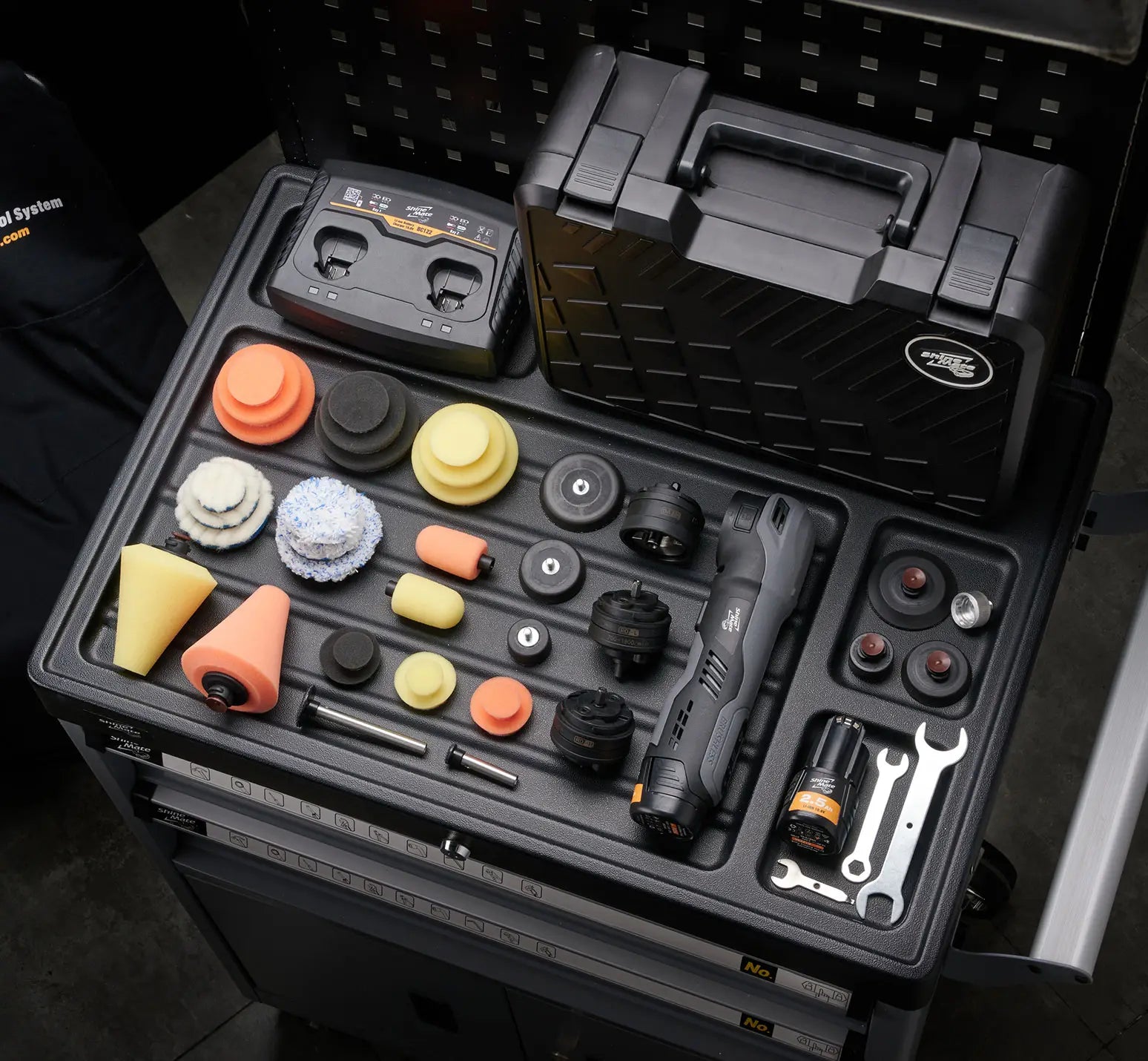 Featuring a powerful battery that provides up to 50 minutes of continuous use, this mini polisher offers the convenience of cordless operation without sacrificing performance. Its compact size and ergonomic design make it easy to manoeuvre into tight spaces and around curves, while its variable speed control allows you to adjust the speed to suit the task at hand.