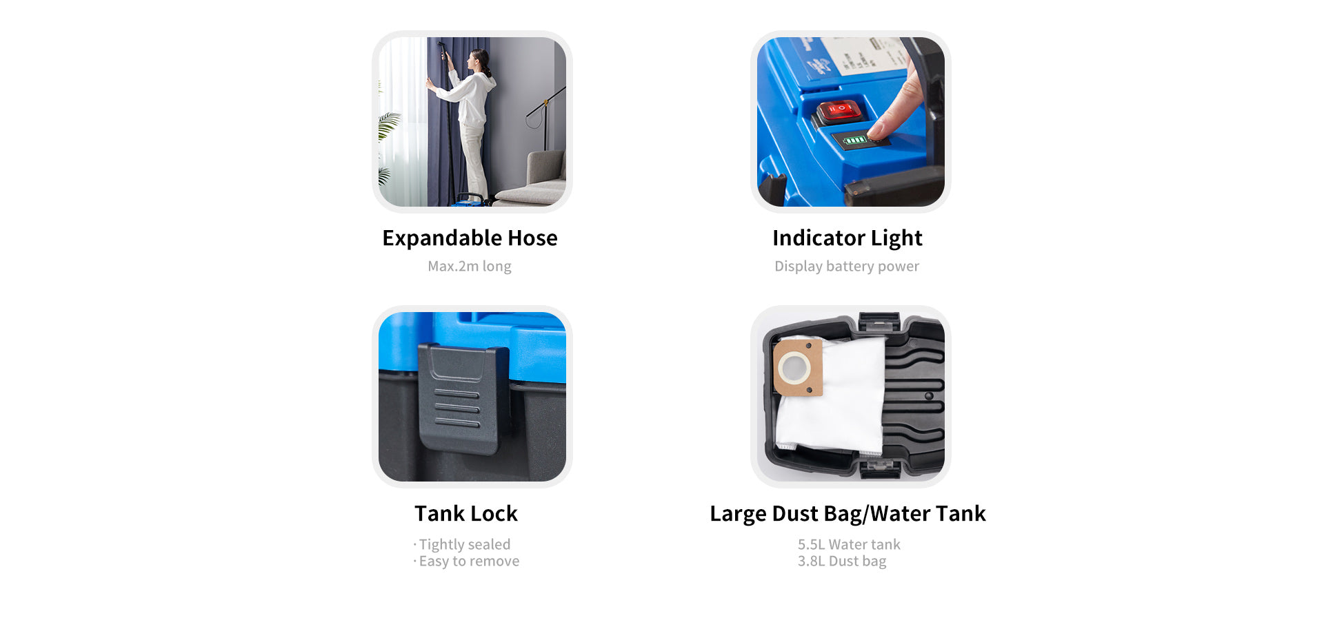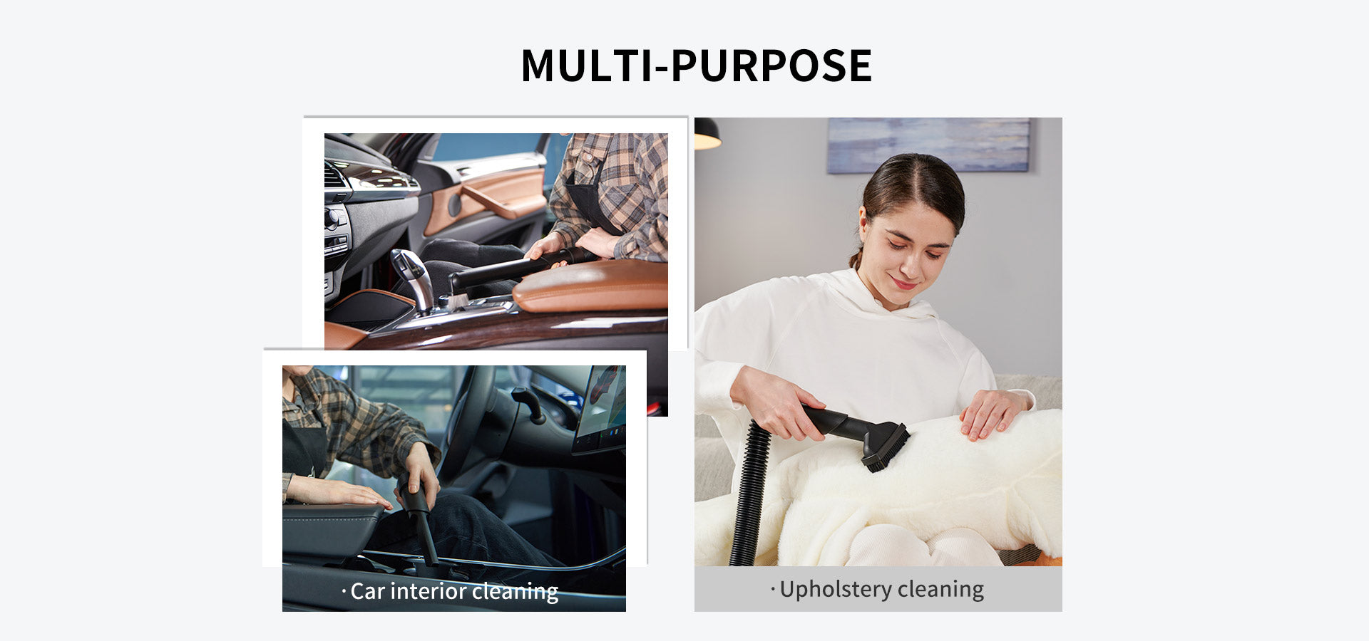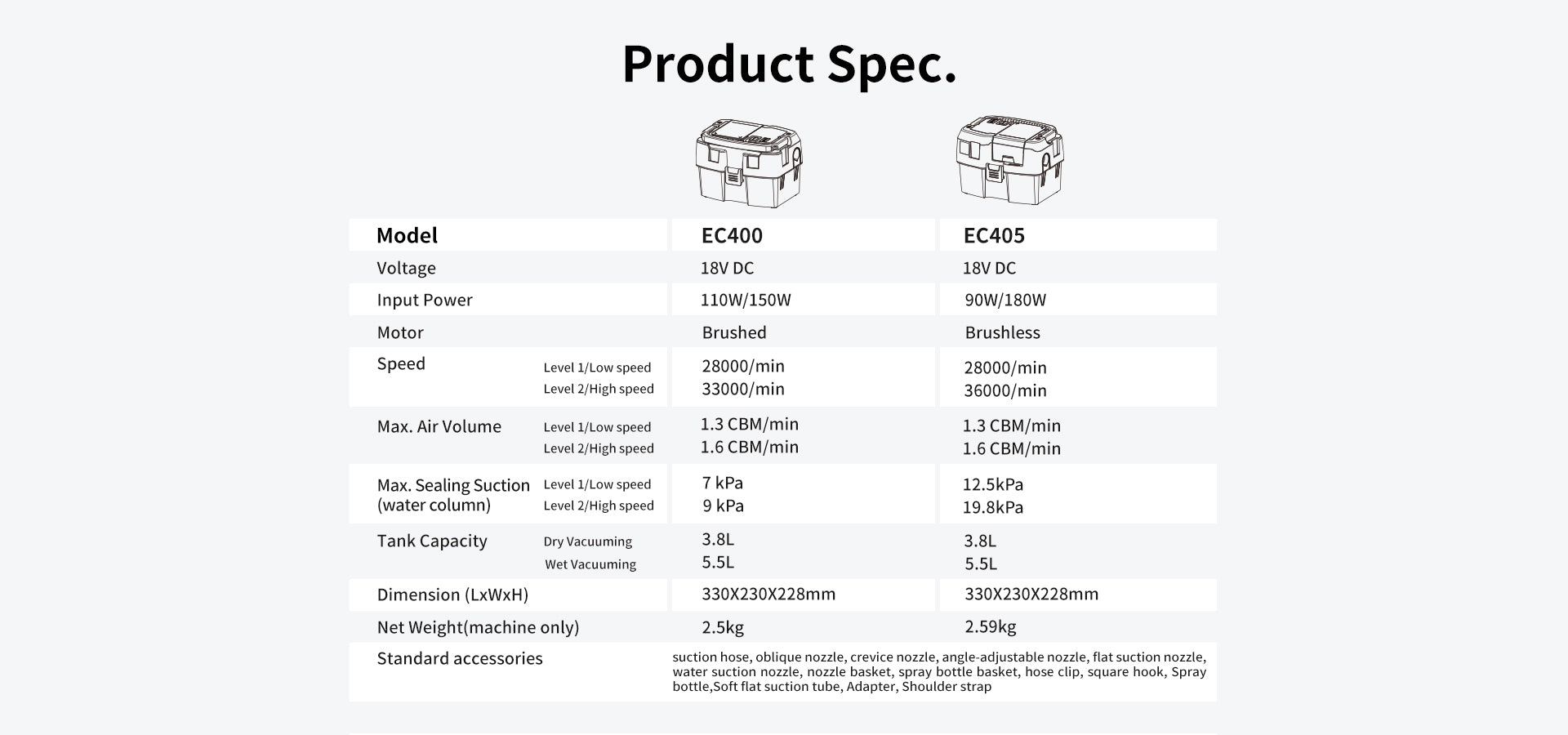 This versatile appliance is equipped with an array of suction nozzles, rendering it a comprehensive tool suitable for various cleaning tasks. The EC400 is engineered for both wet and dry cleaning applications, making it ideal for tackling spills, debris, and dirt on car interiors and fabric surfaces. Its versatile performance ensures a thorough cleaning experience.