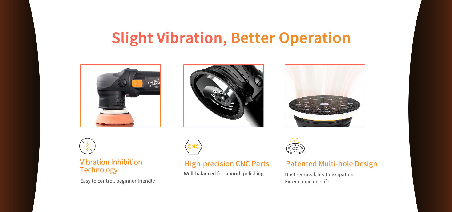 The Shine Mate polishers are also designed for heavy usage under adverse circumstances, the kind of environments detailers often find themselves detailing in are not always hospitable and require their tools to be dependable regardless of climate. With ample ventilation both in the machine body and in the backing plate design itself as well as a soft start system, Shine mate polishers will maintain your pads in excellent condition during repeated heavy correction, even at peak operating performance.